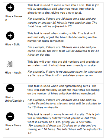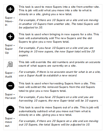 The job cards below are specifically for changing the numbers of hives and supers on a site. Use these correctly as outlined below in order to get accurate reporting.