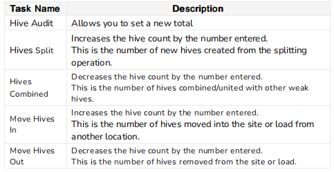 In MyApiary Manager, we use job cards for everything, rather than just updating the new colony total. Using Job card and task allows you to record why the hive numbers changed. Making reporting far more valuable by providing better insights into not just the current hive numbers, but why and how the numbers have changed over time.