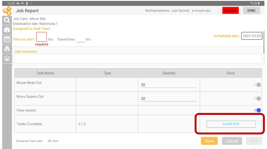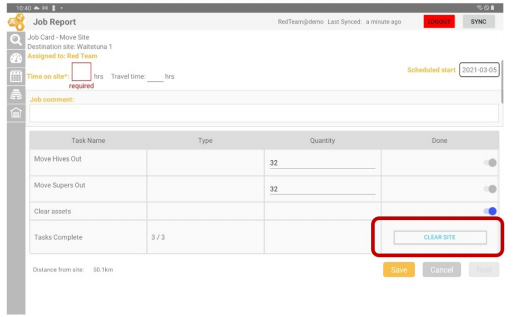 The inputs for this job card are ' xed you can enter the time taken to load and unload the truck, the travel time to the destination site and the number of hives and super moved can be recorded. Using the ‘Clear Site’ button will fill in the hive and super numbers for you if you are moving the entire site.