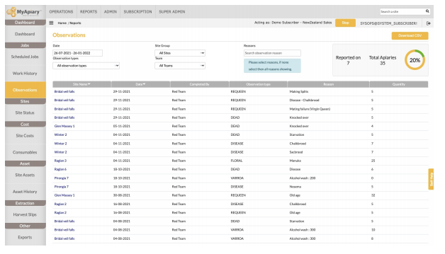 The work observations tab is for reporting on what the beekeeper sees in the field. As shown in the screenshot below, first you need to choose a date range. This can be as large or as small as you like. Once a date range is selected, you can see all of the observations made for that range. Then there are several other things you can do to drill down to more specific observations.