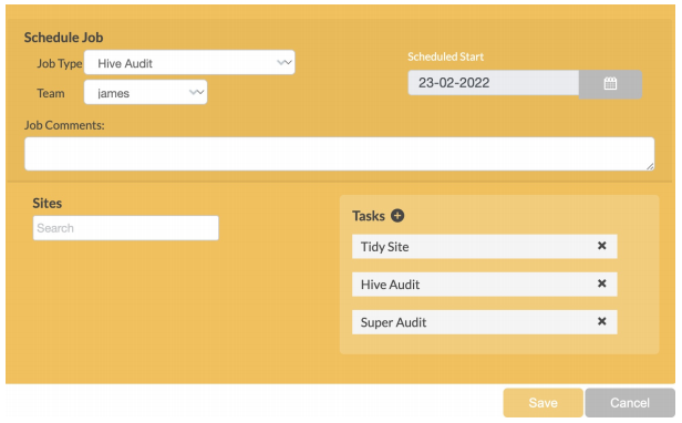 After you have dropped the job onto the day you want, a pop-up (See screenshot of pop-up below) will appear asking for more information. this is where you tell the system, who is doing the job (Team), where the job is (site) and you can also add additional tasks or comments. Once you have completed the pop up simply push save and you are done! you have scheduled a job.