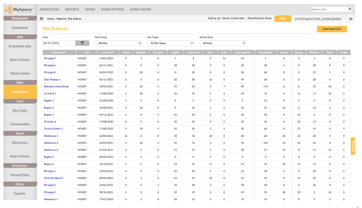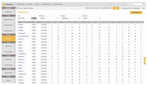 The Site Status report is reporting to see exactly what is on your sites. As shown below the data is sorted by date, starting with the current date. Using the filters, you are able to see the site status from any date since you began to use MyApiary.