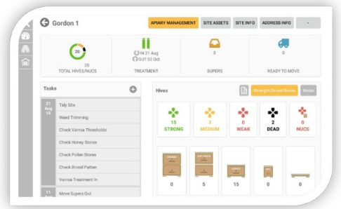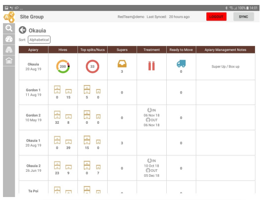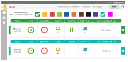Sites can be filtered for most neglected sites. Apiaries are grouped in Site Groups.