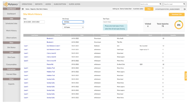 The work history tab reports completed tasks. As shown in the screenshot below, first you need to choose a date range. This can be as large or as small as you like. Then the only other thing you need to select is what tasks you want reporting on. once you have selected an option for both of these fields, you should be presented with something similar to the image below.